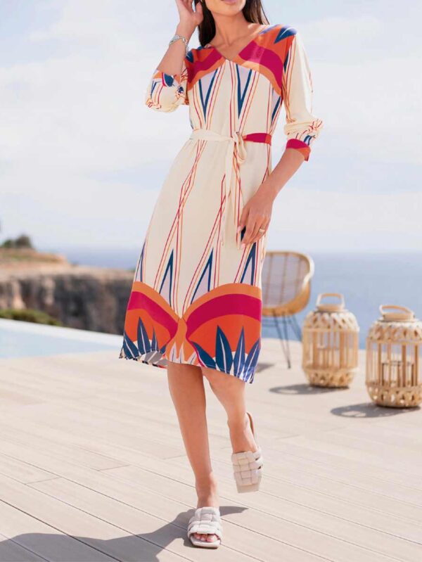 Elegantné šaty Rick Cardona s potlačou vo vysoko módnom dizajne a trendy farebnej kombinácii. Rovný tvar so zaväzovacím opaskom, výstrihom do V a malými bočnými rozparkami. Dlhé rukávy s rozparkovanými manžetami.