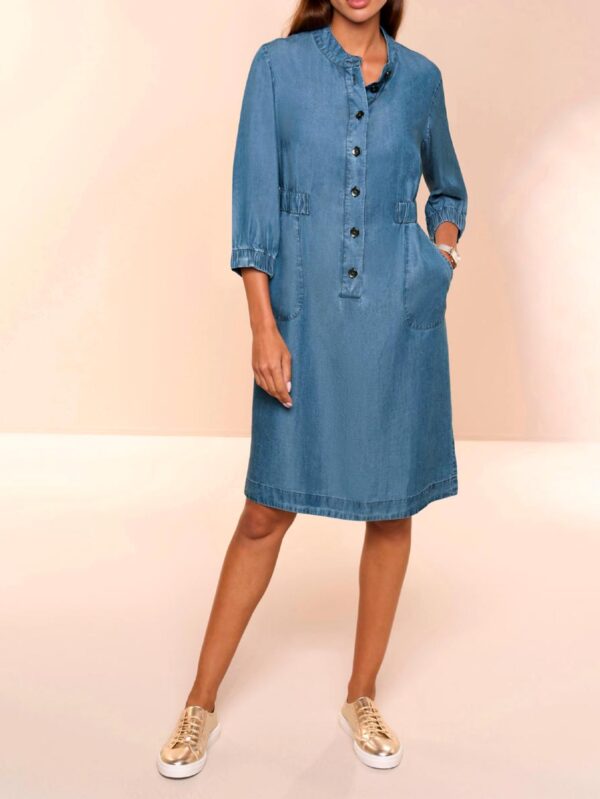 Super pohodlné šaty Rick Cardona vyrobené z nádherne hebkej kvality Lyocell v trendovom džínsovom vzhľade s efektom stonewashed. So stojačikom a gombíkovou légou po boky. Náplasťové vrecká.