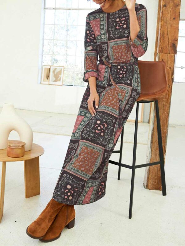 Dámske džersejové šaty Linea Tesini v mixe vzorov s módnou nášivkou. Naberaný elastický pás vo výške pása a zaväzovací opasok zaisťujú skvelú postavu. Pútka na opasok. 3/4 rukávy s pevnou manžetou a zapínaním na gombík.
