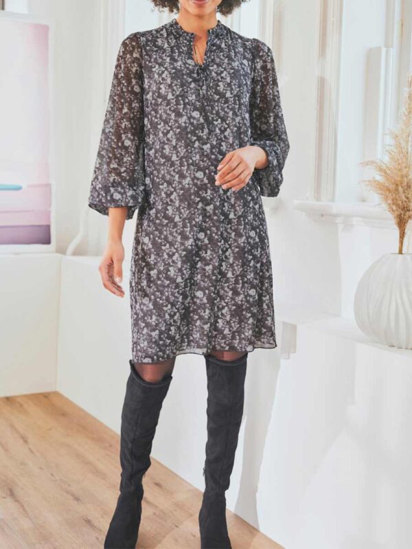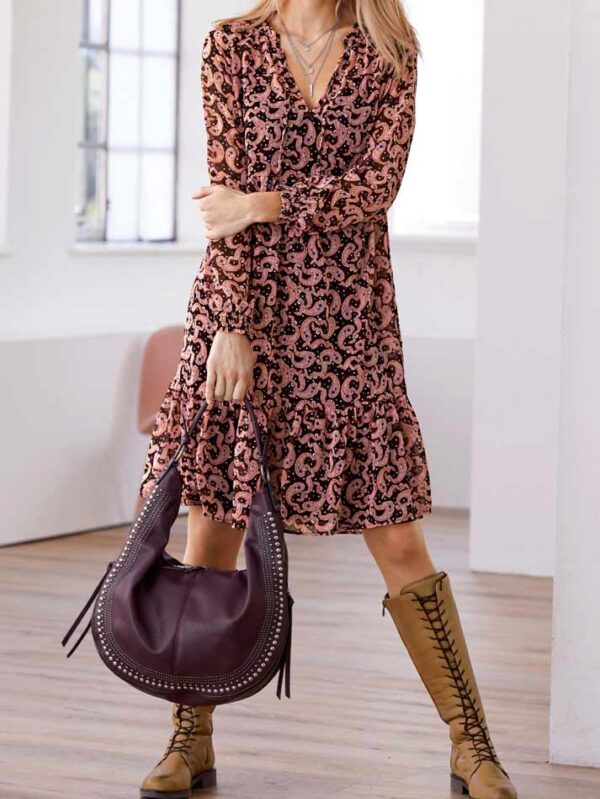 Ležérne, moderné a také ženské! Tieto atraktívne šaty zaujmú svojim špičkovým dizajnom s hravou potlačou paisley/kvetinového vzoru a prepracovanými detailmi: strihaný stojačik na okrúhlom výstrihu, rozparok v dekolte so zaväzovaním a dlhé, široko strihané raglánové rukávy s česanými elastickými manžetami. Skvelý lichotník postave v lichotivej A-siluete s tvarujúcimi prsnými šípkami, podprsným švom a krásne hojdajúcim sa volánovým spodným lemom. Veľmi praktická odnímateľná spodnička s nastaviteľnými špagetovými ramienkami.