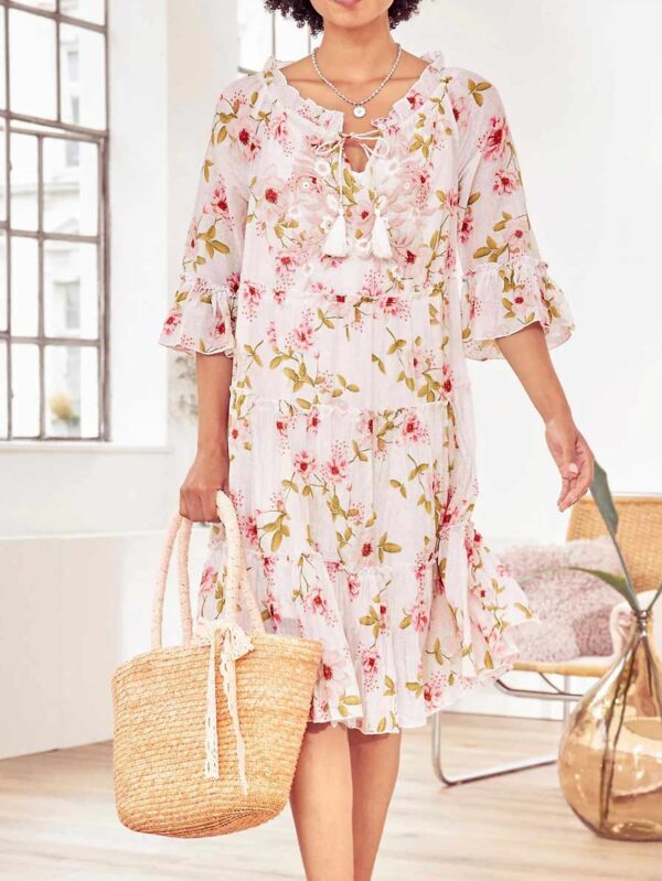 Šaty Linea Tesini s láskou k detailu zapôsobia svojou štýlovou a nadčasovou prepracovanosťou. Kvetinová pútavá potlač v trendovej farebnej schéme s prepracovanou kvetinovou výšivkou! Hravý štýl vo vráskovom vzhľade s volánmi na 3/4 rukávoch a spodnom leme Ženský, elastický okrúhly výstrih s volánovým lemom, rozparkom v dekolte, zaväzovacím remienkom a strapcami, možno nosiť aj ako Carmen výstrih. Lichotivý áčkový strih s odstupňovanou sukňou a rozšíreným spodným lemom.
