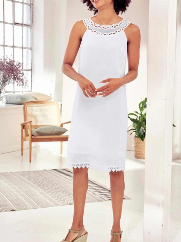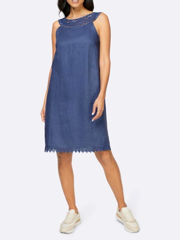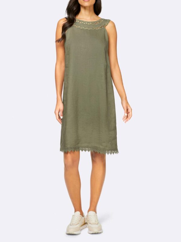Šaty Linea Tesini s očarujúcim dizajnom. Letný favorit vyrobený z čistého ľanu. Elegantne sa krčí a zapôsobí hodvábne matným leskom. Štýl bez rukávov. Široký okrúhly výstrih s ozdobnou makramé čipkou. Lem je tiež zakončený čipkou. Zapínanie na rozpark a gombík pri krku.