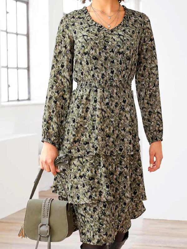 Jednoducho fantastické: nápaditý štýl vyžaruje čistú radosť zo života. Prepracované šaty Linea Tesini v luxusnom maskáčovom vzhľade. Silueta obopínajúca postavu so širokým pásovým sedlom a volánovou stupňovitou sukňou s rozšíreným spodným lemom. Špicatý výstrih s volánovým lemom. Široké rukávy s elastickými manžetami.