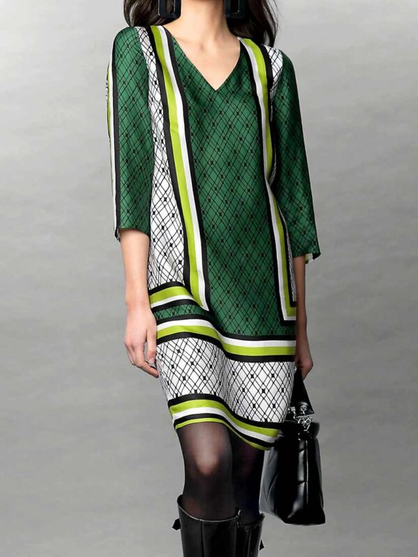 Módne, pútavé šaty Mandarin s našitou potlačou vpredu. Skvelé pohodlie pri nosení, ležérne a pohodlné. Štýl s 3/4 rukávmi a okrúhlym výstrihom. Dĺžka cca 92 cm.