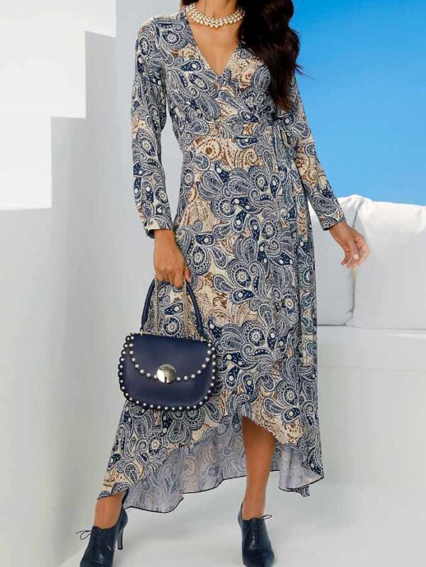 Tieto vzrušujúce zavinovacie šaty od Ashley Brooke budú vaše nové obľúbené. Suverénny pútač v sofistikovanom paisley dizajne. Silueta obopínajúca postavu s výstrihom do V, dlhými rukávmi s manžetami na gombíky a sedlom v páse s integrovanými zaväzovacími remienkami na úpravu šírky.