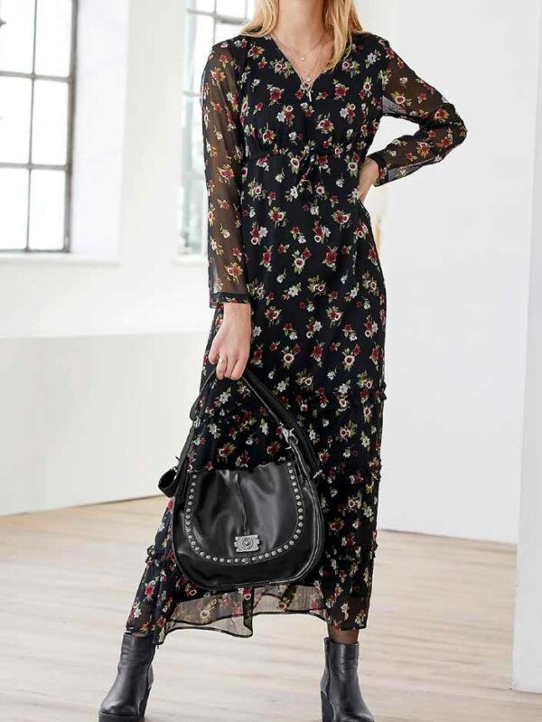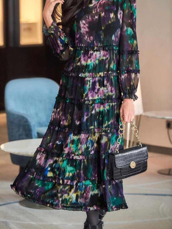 Elegantné šaty s potlačou v miernom A-čkovom tvare s efektným dizajnom. Bohaté volány pozdĺž šiat a na dlhých rukávoch. Dlhé rukávy s elastickými manžetami, vyrobené z mierne priehľadného šifónu. S okrúhlym výstrihom a zapínane.