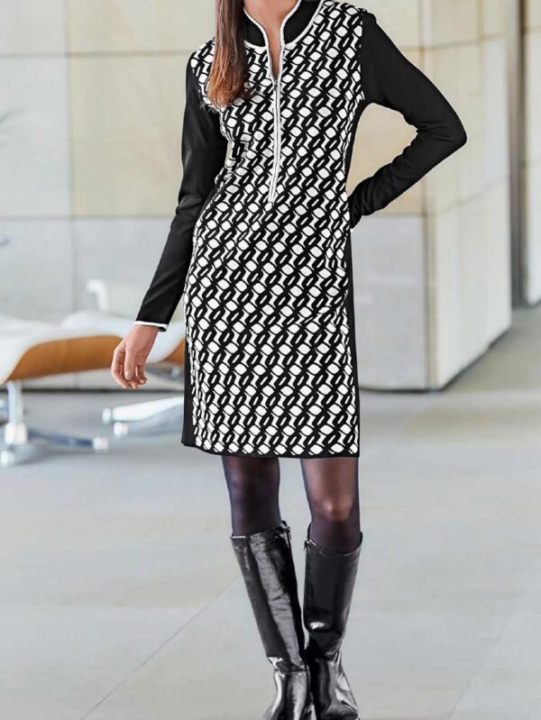 Očarujúce pletené šaty Rick Cardona v aktuálnom mixe farieb a vzorov. Predný zips po pás. Stojačik s okrúhlym výstrihom. dlhý rukáv. Rovná forma.
