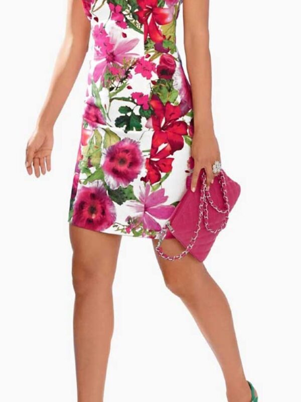 Absolútna krása od Ashley Brooke v nápadne krásnej, farebnej celoplošnej kvetinovej potlači. Elegantné, postavu obopínajúce puzdrové šaty so štýlovým štvorcovým výstrihom. Vzadu jemný zips. Zadný rozparok pre väčšiu voľnosť pohybu.