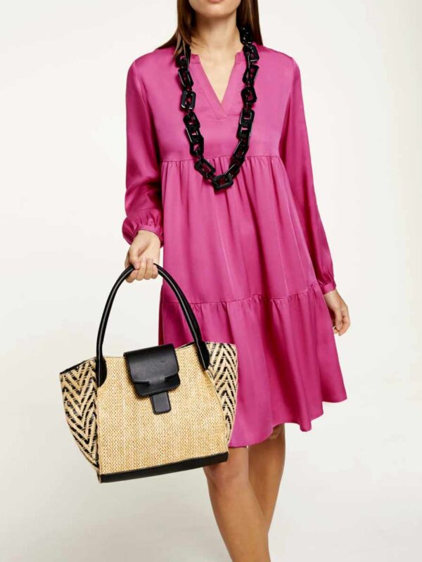 Úžasne šaty od Ricka Cardony v jemne trblietavom fuchsiovom tóne a sofistikovanom stupňovitom vzhľade. Priliehavý, rozšírený tvar so štýlovým výstrihom a dlhými širokými rukávmi s úzkymi manžetami na gombíky. Dĺžka cca 104 cm.