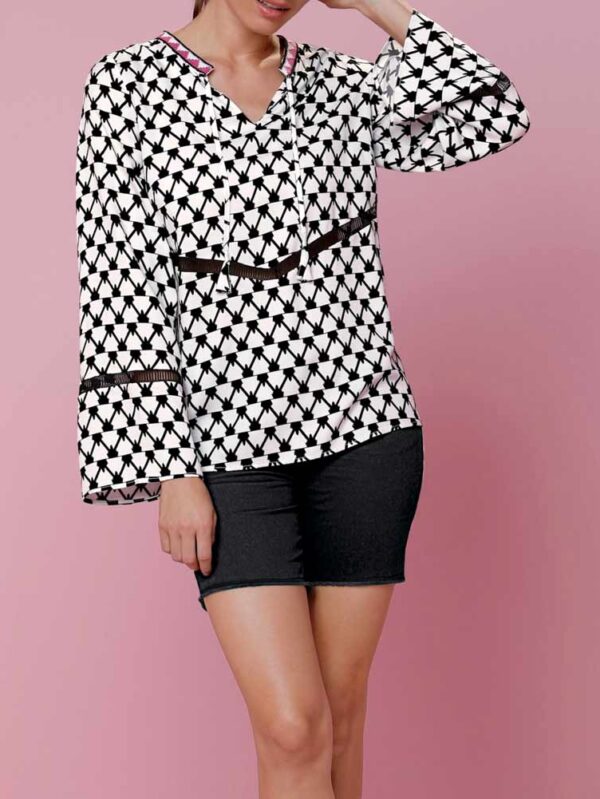 Blúzka Creation L s grafickou potlačou. Má ležérny tvar s výstrihom do V, krátkou gombíkovou légou, zadné sedlo so záhybom a dlhším zaobleným spodným lemom vzadu. Dlhé rukávy s manžetami sa dajú vyhrnúť a zaistiť pomocou lišty a gombíka.