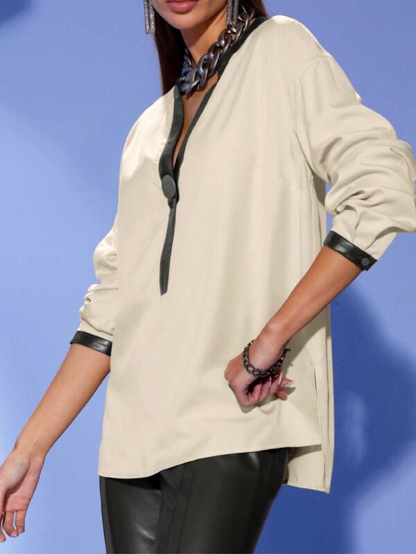 Blúzka Creation L vo výhodnej dĺžke zvýrazňuje výstrih do V moderným lemom z imitácie kože a veľkým ozdobným gombíkom. Zdobené sú aj gombíkové manžety dlhých rukávov. Spodný lem je vzadu o niečo dlhší a má vysoký bočný rozparok pre väčšiu voľnosť pohybu.