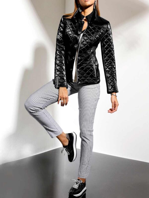 Silný vzhľad pochádza z lesklého PU povlaku vo vzhľade laku. Prídavný vnútorný stojačik je pletený a dá sa úplne zapnúť na zips po celej dĺžke. Skryté pásikom na patentky až po vonkajší golier. Tvarovanie viedenských švov. 2 vrecká na zips. 1 vnútorné vrecko. Zipsy striebornej farby aj na manžetách. Celkový obraz dopĺňa lemovanie z imitácie kože.